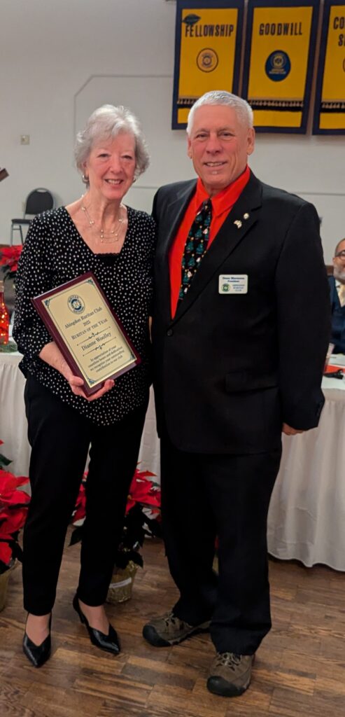 2025 President Dean Marzocca presented the Abingdon Ruritan Club Ruritan of the Year Award to Club Secretary Dianne Woolley. She was recognized for her exemplary efforts to ensure that all Club donations and volunteer hours were recorded and properly and timely submitted to the District. Dianne is shown receiving the plaque from Marzocca.