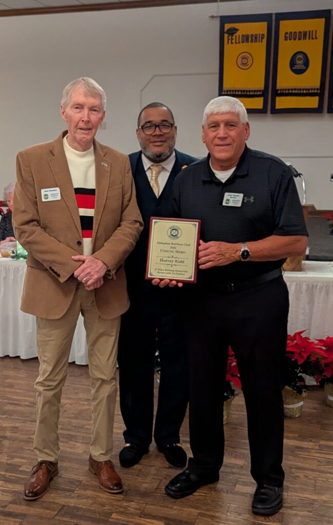 2026 President Antonio Donald observed a long-standing Club Member who works diligently and quietly when no one is watching. This member who is multi-talented and always seeks the best for the Club. His name is Harvey Kidd and typical of his demeanor, he was not available to receive his recognition at the December meeting. So, President Antonio chose two of Harvey’s friends to stand in for him and receive the Unsung Hero’s Award for him. Shown receiving the plaque are friends of Harvey’s, Dick Beasley and John Snyder.