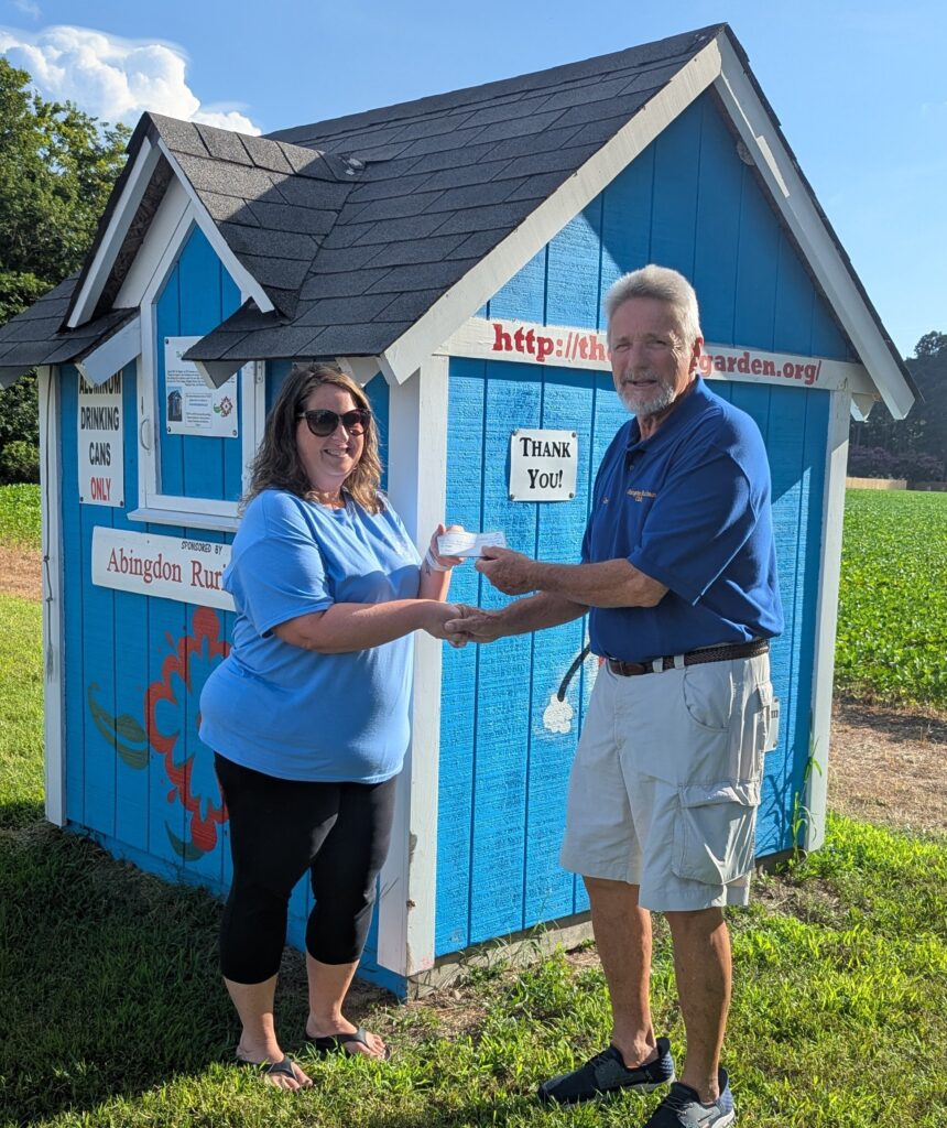 Abingdon Ruritan Club (ARC) fights cancer. For example, there is a small hut located adjacent to the back parking lot at the Club. Club members and others deposit aluminum cans for recycling. Club member Allen Scale empties the hut at least twice a month and carries the cans to the Gloucester Area Recycling Center located at the Gloucester Moose Lodge for ultimate transport to the Recycling Center in Hampton, Virginia. The money from the recycling is given to the Gloucester Giving Garden Foundation which provides financial assistance to cancer patients who reside in Gloucester or Mathews County. In addition, ARC gives an annual $3000 monetary donation to the Foundation. Shown in the photo below is Allen Scales presenting the check to Foundation member Heather P. Smith in front of the hut.
