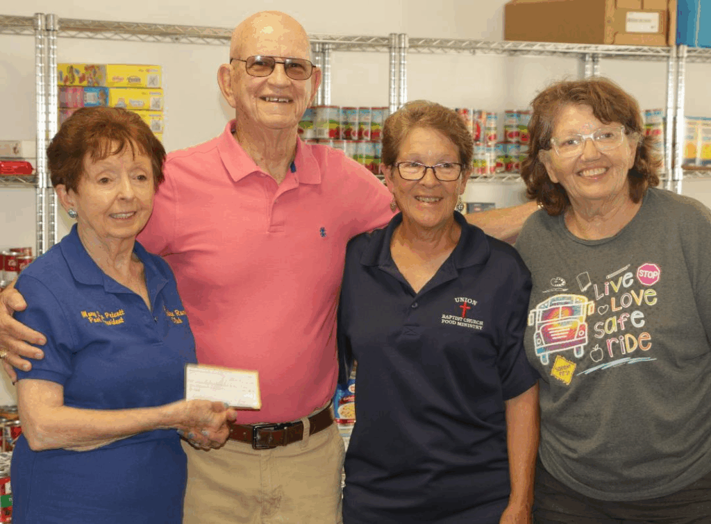 Abingdon Ruritan Club (ARC) supports the Union Baptist Church Food Pantry. Shown in the photograph is Mary Lou Privott, ARC Past President, presenting a check for $1000 to AB Fulcher, Union’s long-time Manager of their Food Pantry. Shown also are Becky Jenkins and Donna Green two of his assistants.